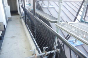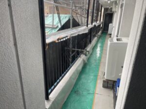 サッシや渡り廊下の手すり、床面を養生材で保護し、塗料の飛散を防止します。