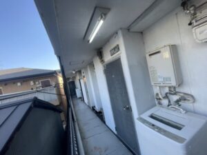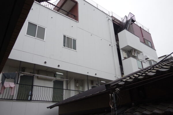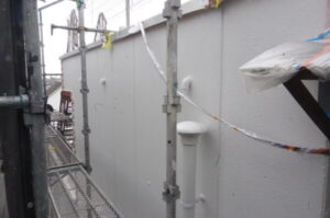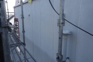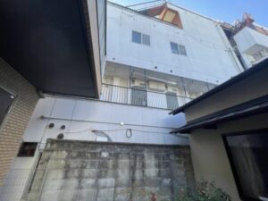 雨漏り箇所は3階部分の外壁にあり、高所作業のため足場の設置が必須でした。 隣地と密接していましたが、お隣のアパート通路を作業動線としてお借りできることとなり、無事に施工準備が整いました。 今回は、雨漏り修繕と併せて**「将来的なメンテナンスコスト」**を考慮し、足場があるこの機会に周辺外壁の塗り替えも 同時に行うこととなりました。
