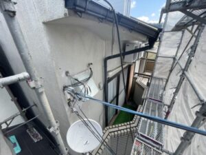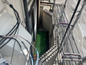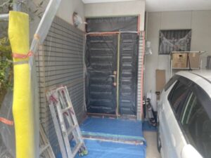 付帯部分は外壁に接近しているので塗料が付いてしまうのを防ぐ為、養生でマスカーテープやノンスリップシートを貼り付け敷き詰めて塗料の付着から守ります。