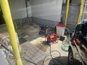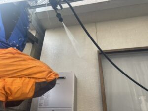 朝から高圧洗浄の開始です、二階建てのお住まいを屋根から玄関先までしっかり