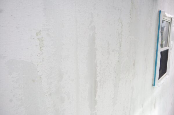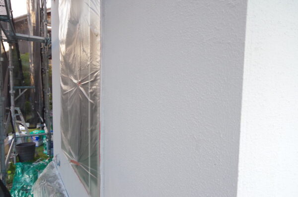 - 中塗り・上塗り(ソフトリシン・吹き付け仕上げ)https://www.sk-kaken.co.jp/product/exterior-finish-materials/softlithin/ 不陸(凹凸)が解消された壁面に、吹き付け塗装を2回行いました。塗り重ねることで塗膜に厚みを持たせ、補修跡が全くわからない状態まで復元しました。