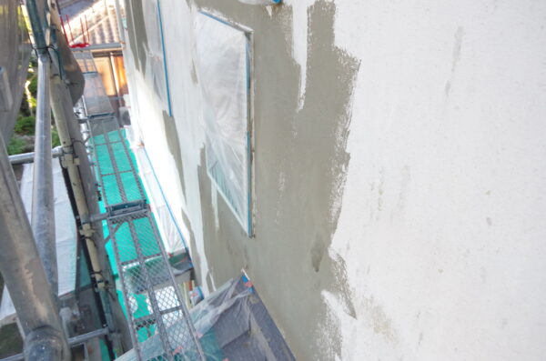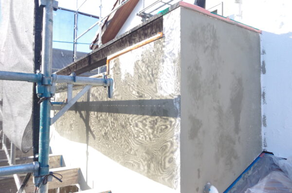- セメントフィラーによる下地調整(重要工程)https://www.sk-kaken.co.jp/product/undercoating-materials/kaken-cement-filler/ 剥がれた部分と残っている部分の段差をなくすため、セメントフィラーを塗布して表面を平滑に整えました。この「ひと手間」が仕上がりの美しさを左右します。