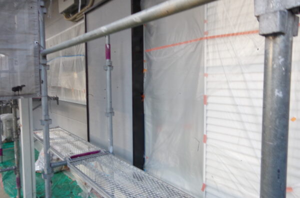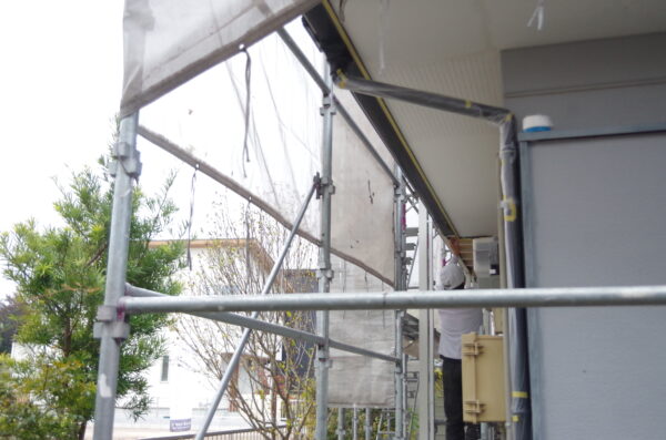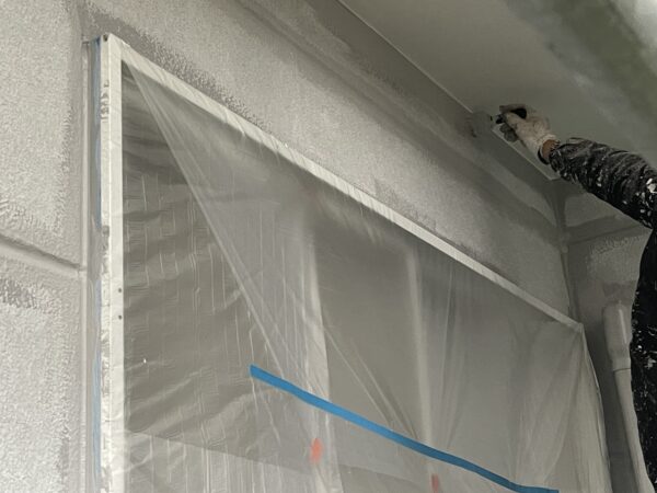 その後、窓や板金部分、玄関タイルなど、塗料が付着してはいけない箇所をマスカーテープ等の養生材で丁寧に保護(養生) していきました。