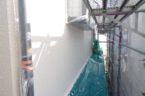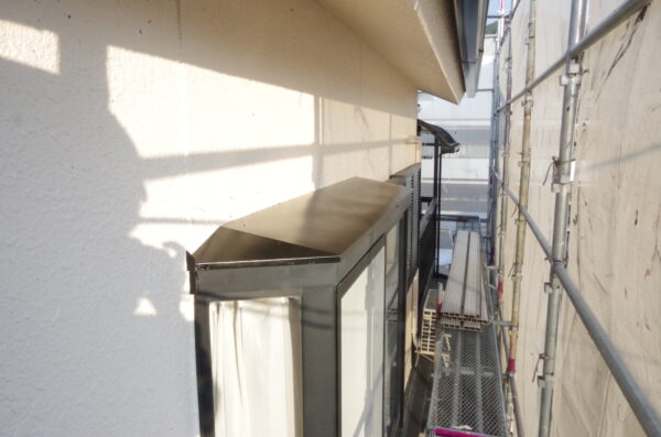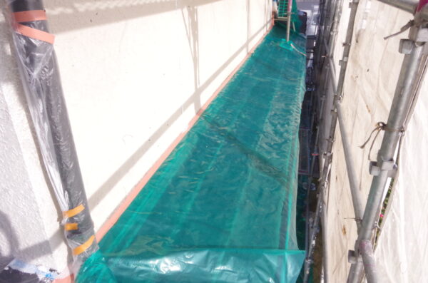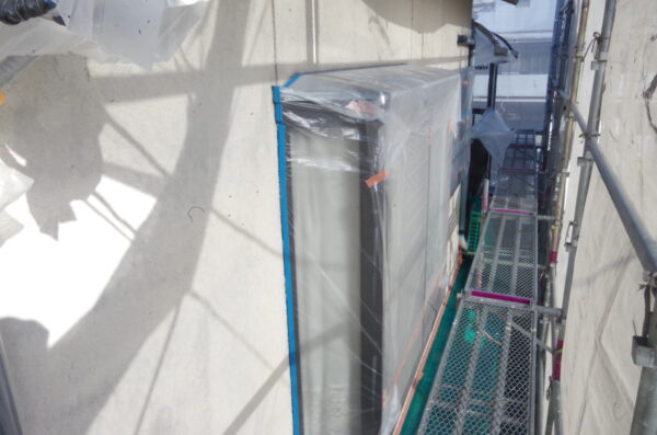 高圧洗浄後、まずは徹底した養生(保護)を行います。雨樋や庇、エアコンカバーなどを丁寧に保護し、