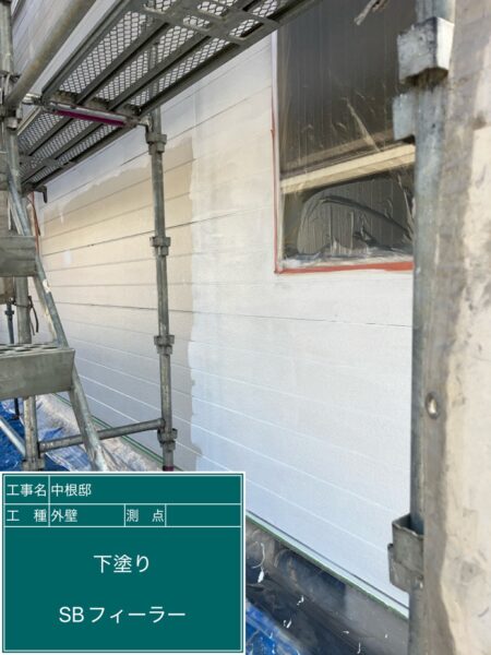 窯業系サイディング専用の下塗り材(ロックペイント・SBフィラー)を全体に塗布し、密着性を高めます。