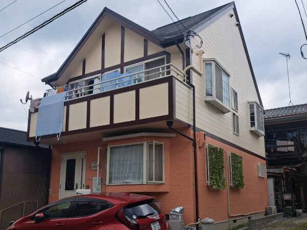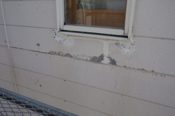 外壁はツートンカラーのサイディング壁です。全体的に経年劣化が見られ、特に窓まわりの傷みが目立っていました。